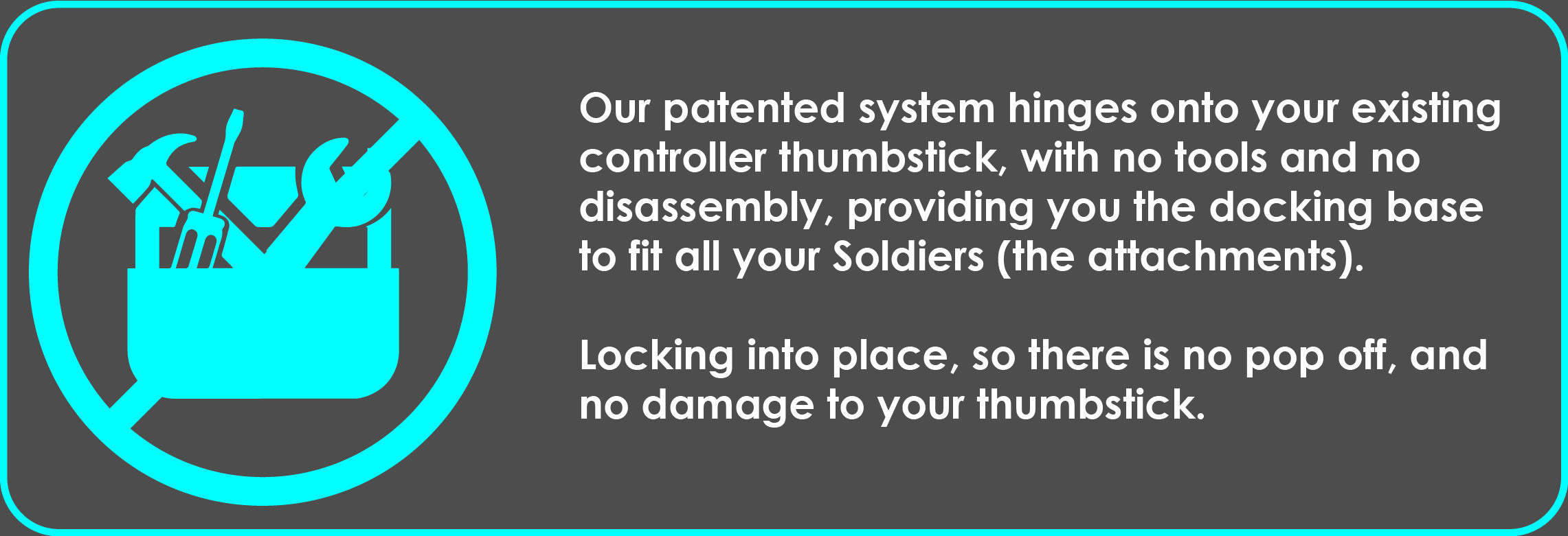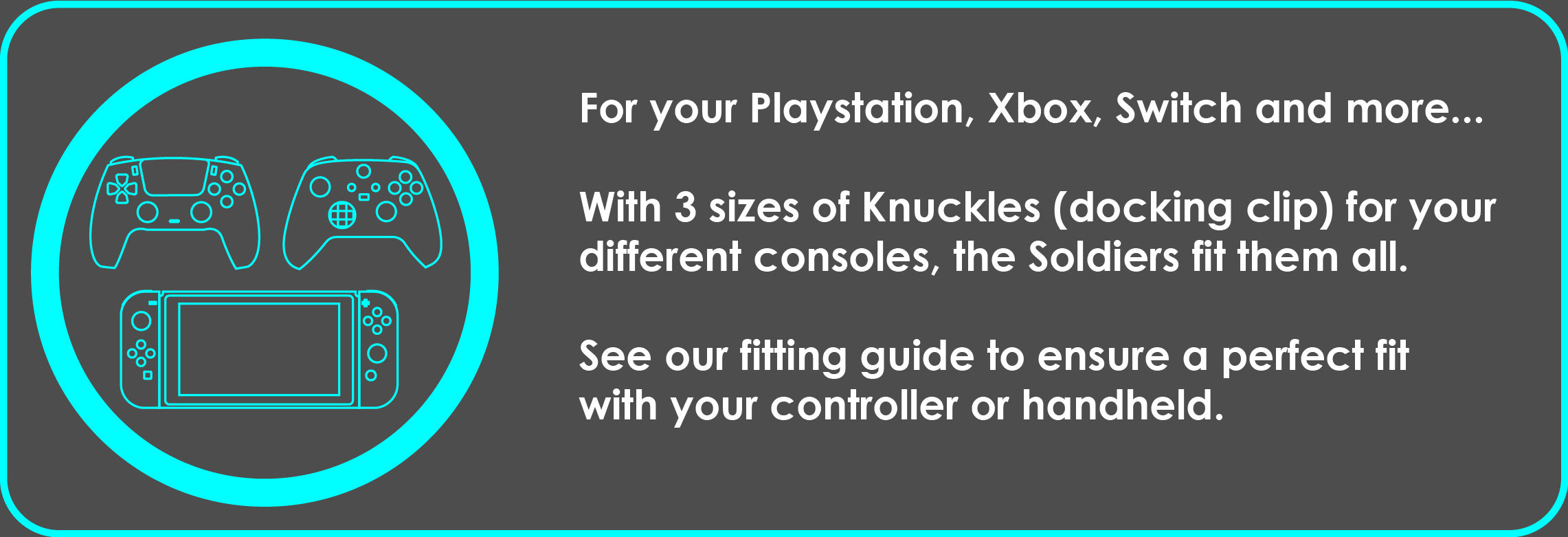 Thumb Soldiers’ innovative ‘Knuckles’ are the base docking clip to fit your ‘Soldier’ attachments on your controller.