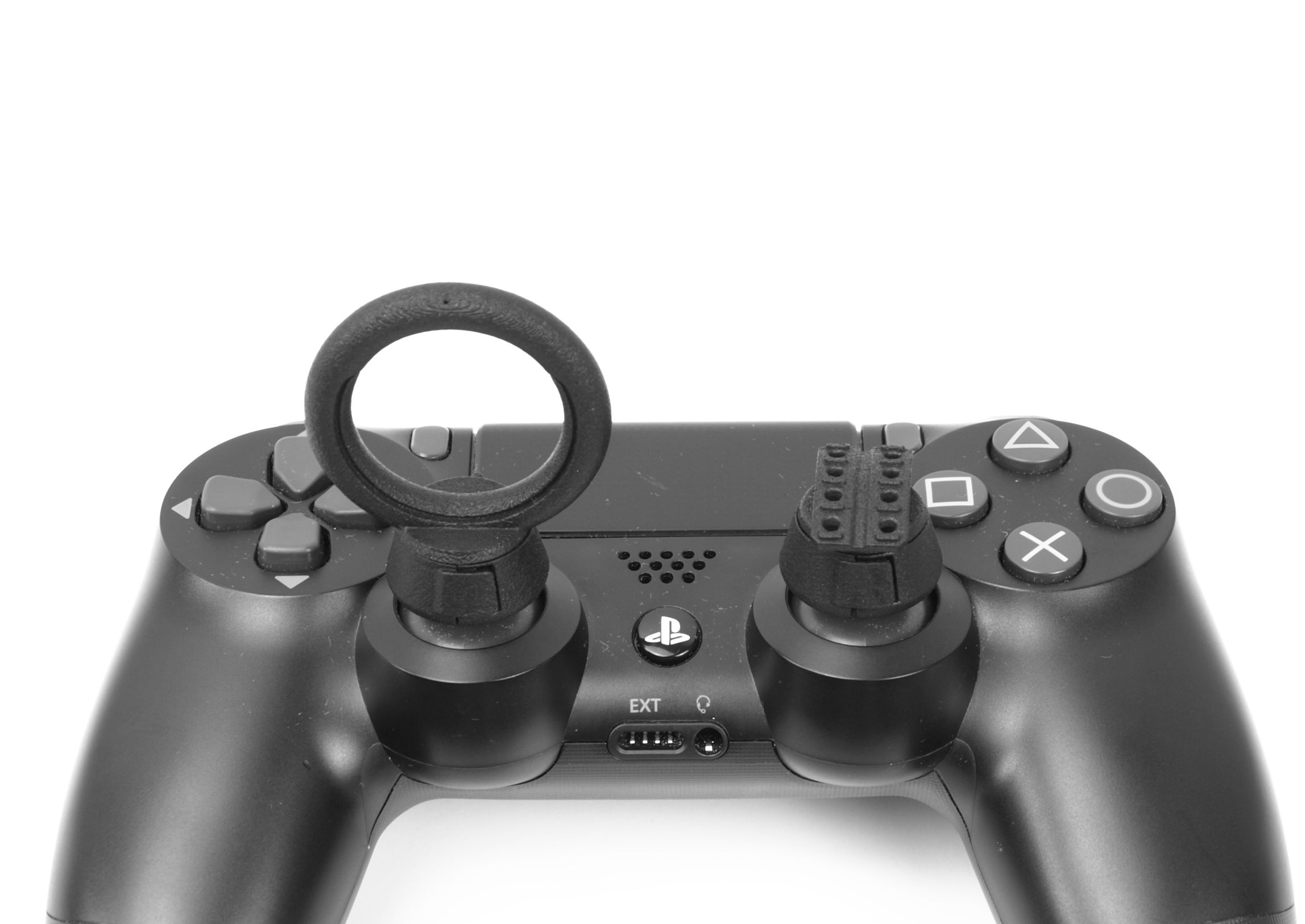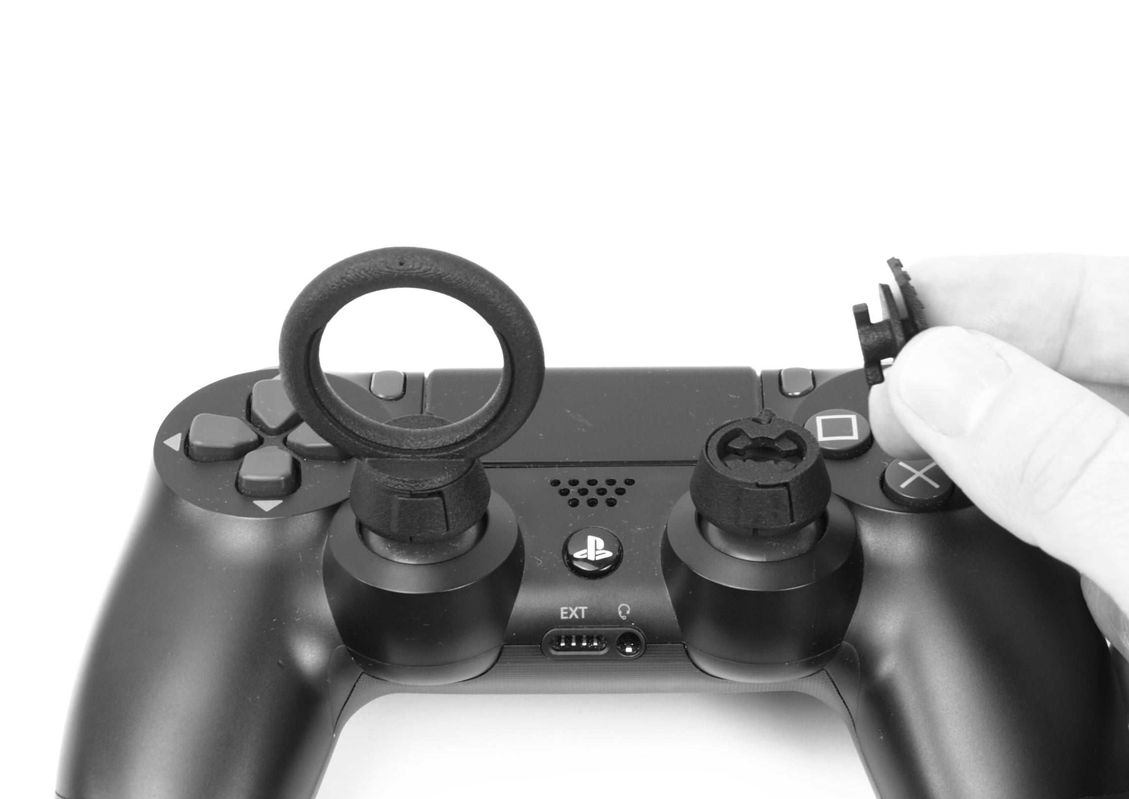 Click in Place: Open the Knuckle and slide onto the thumbstick, click shut; repeat on the other thumbstick of your controller.